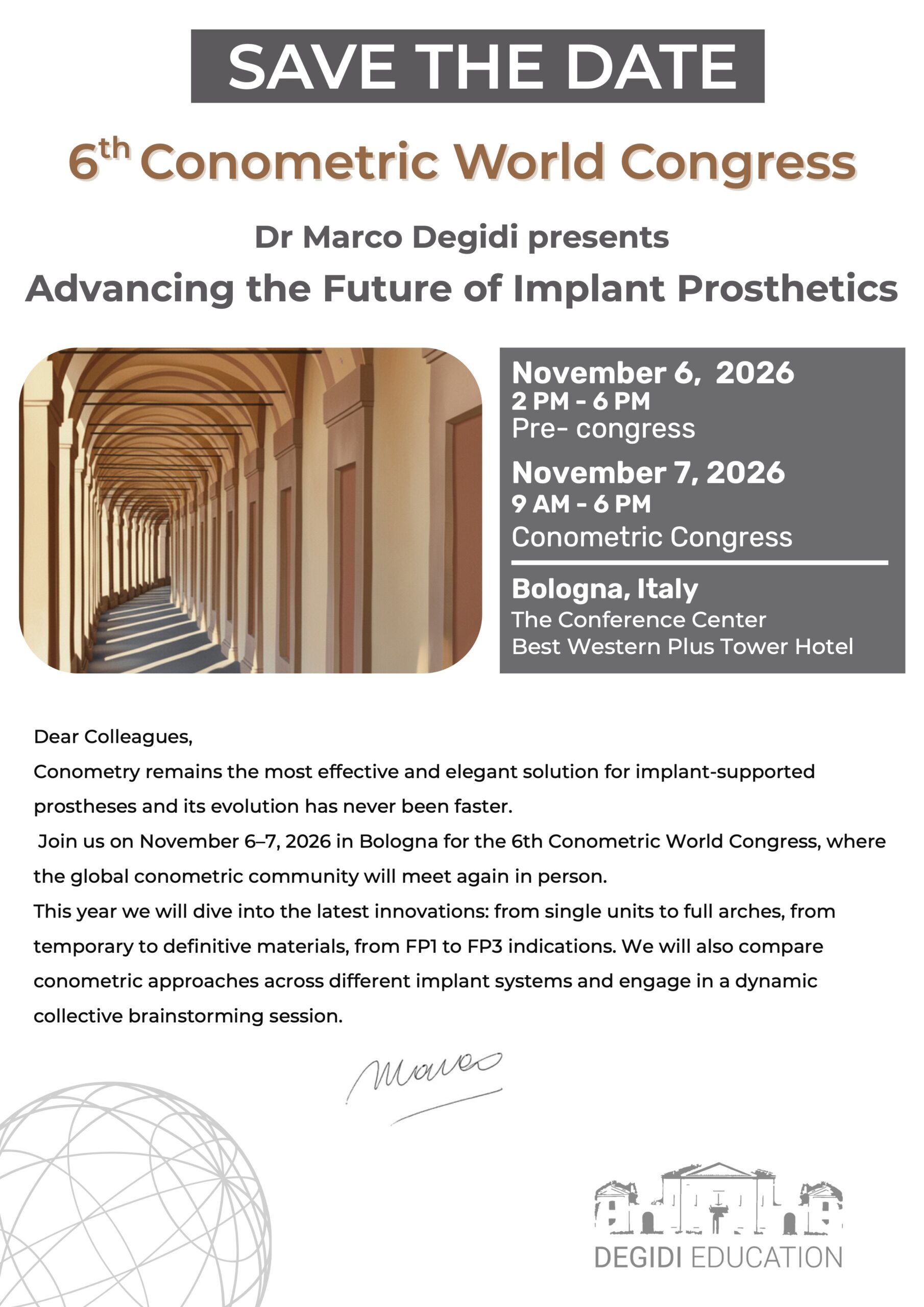 6th Conometric World Congress Advancing the Future of Implant Prosthetics November 6 - 7, 2026 Presentation Dear Colleagues, Conometry ...
